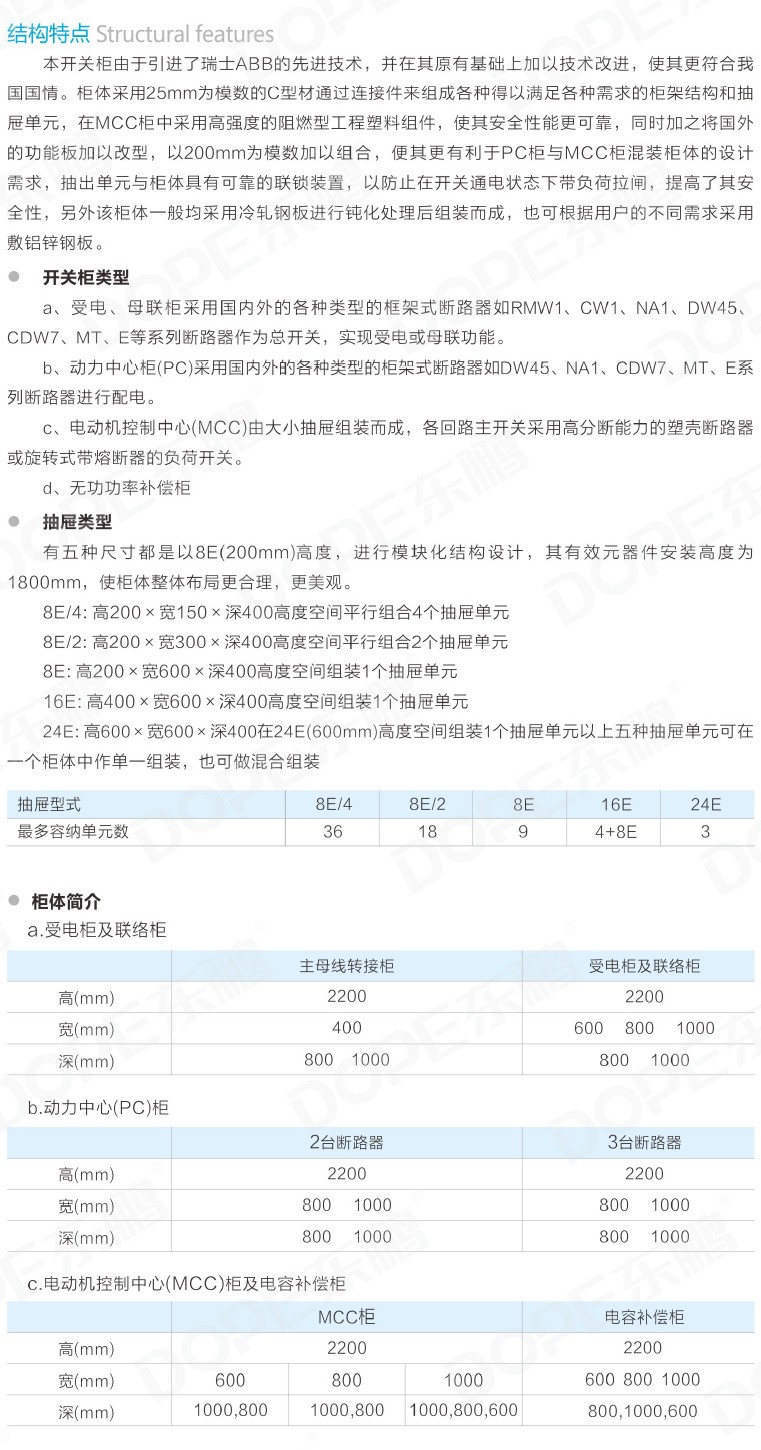 3.采用标准模块设计:分别可组成保护、操作、转换、控制、调节、测定、指示等标准单元。用户可根据需要任意选用组装,以200余种零件可以组成不同方案的柜架结构和抽屉单元。